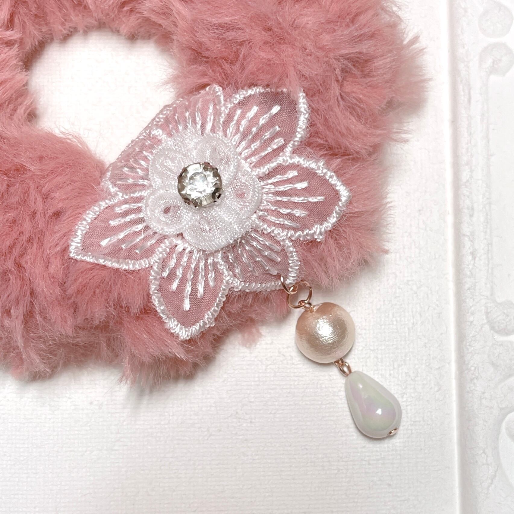 ビジューが光る透け感が美しいお花レース。ピンクベージュのコットンパールとツヤツヤのドロップパールが動くたび揺れます。