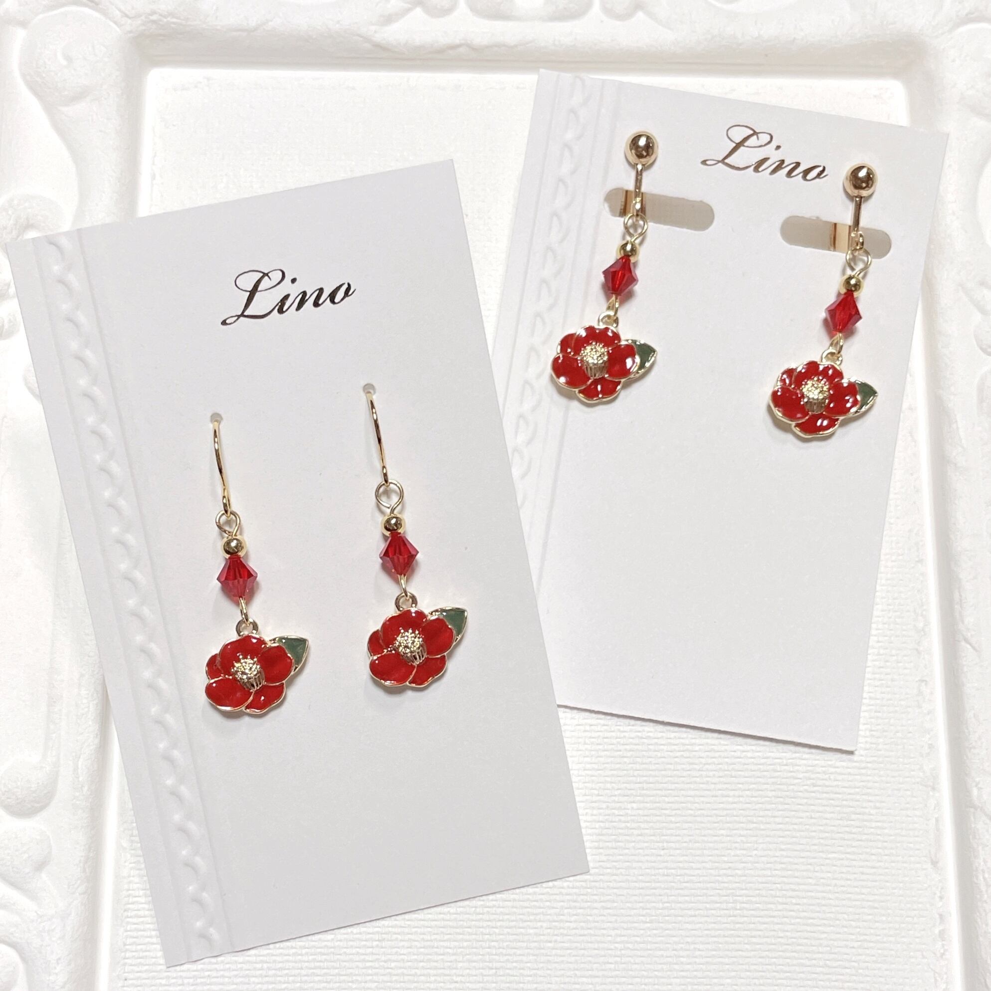 冬の花、椿。寒さの中で華やかに強く咲き誇る日本の美です。鮮やかな朱色は顔まわりを明るく見せてくれます。モチーフは小ぶりですが、艶やかで主役級の存在感です。着物コーデにもGood。