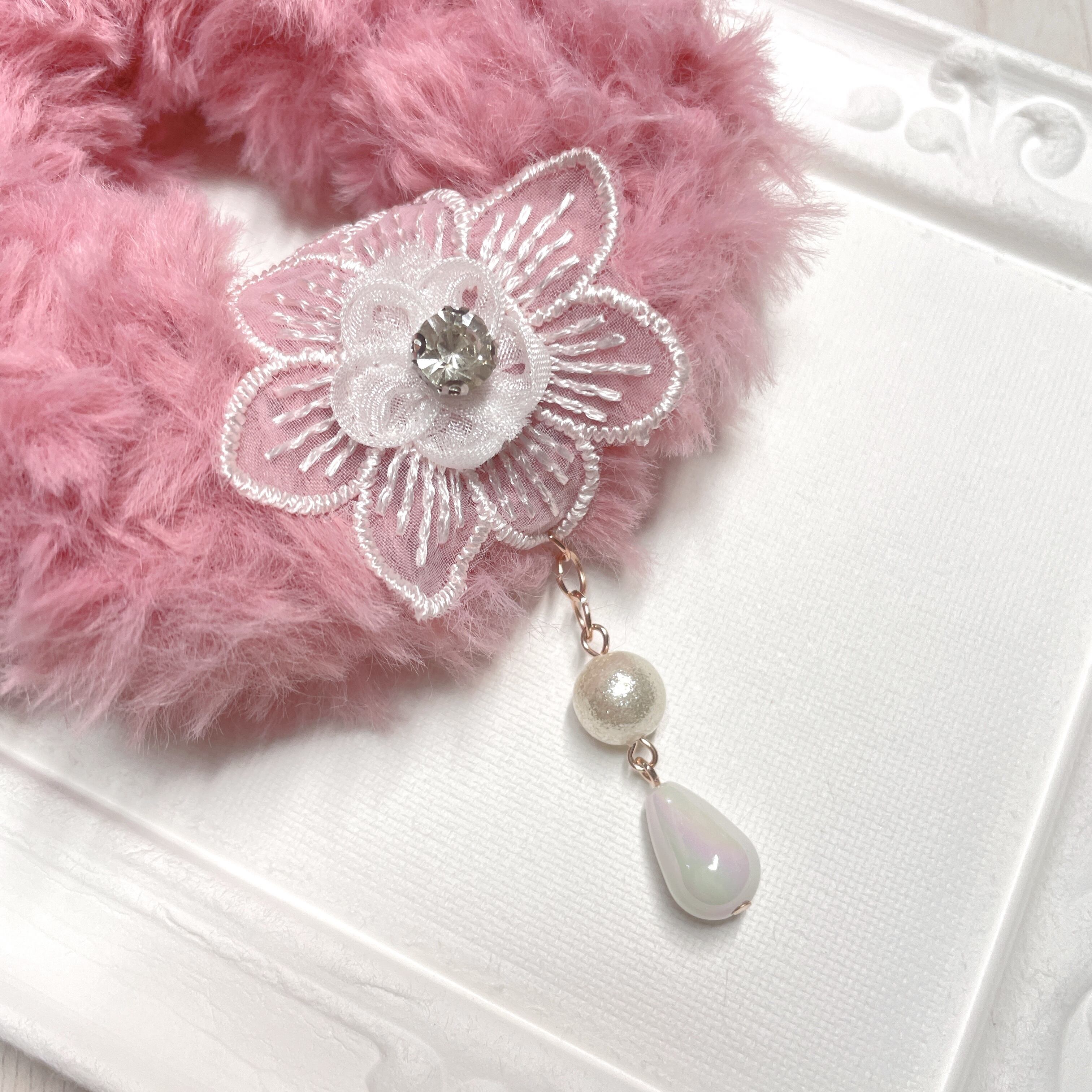 ビジューが光る透け感が美しいお花レース。ラメ加工のパールとツヤツヤのドロップパールが動くたび揺れます。ふんわり軽く、ピンクカラーがキュートです♡