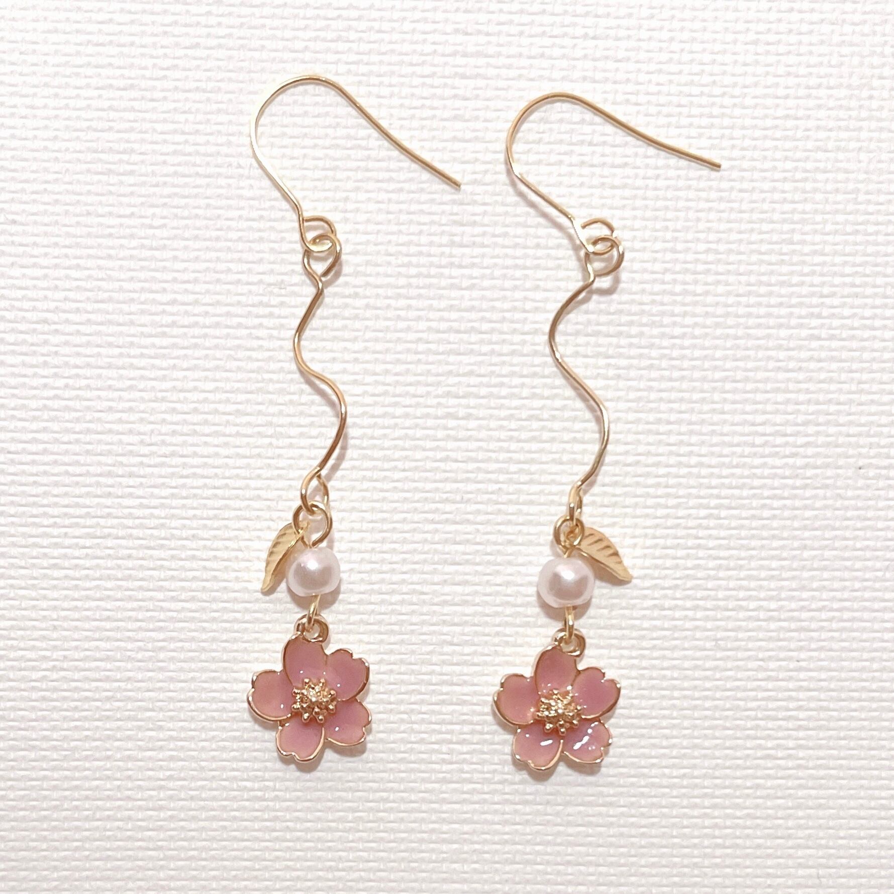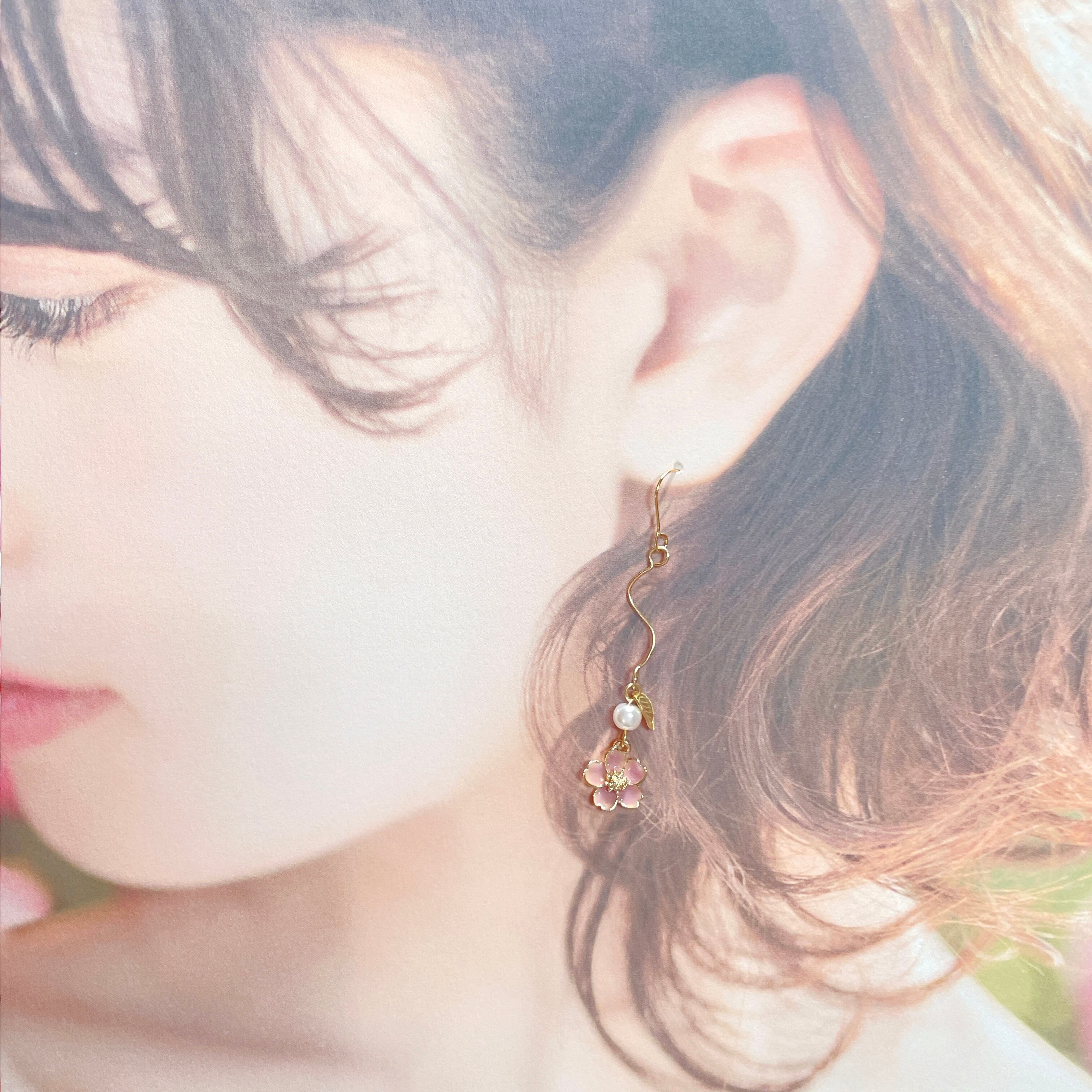 彩やかなピンクの桜を繊細なリーフを添えて揺れるスタイルにデザインしました。ゴールドが引き立ち大人な印象に。華奢なデザインながらも個性的で、この春の主役になれること間違いなし♡