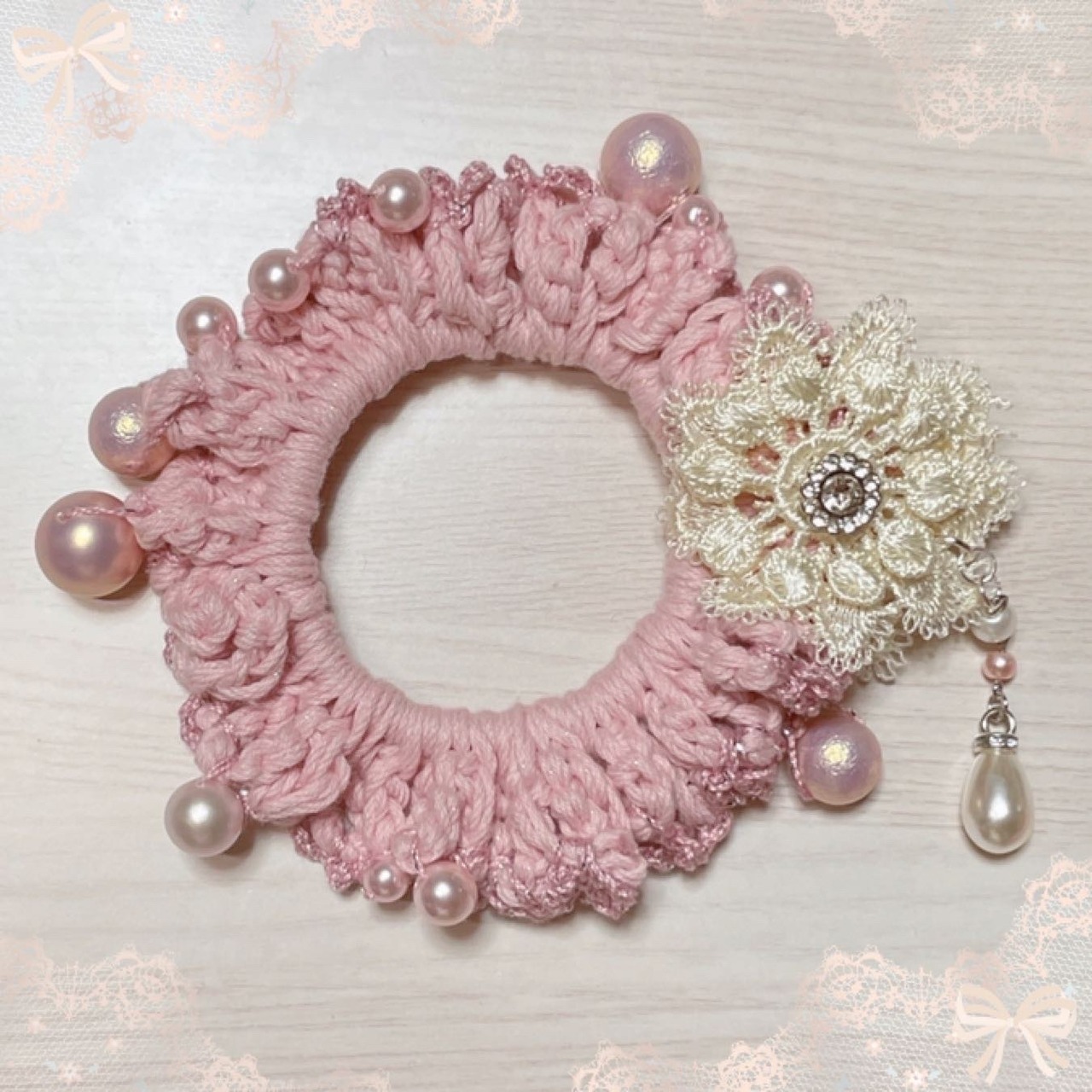 ベビーピンクのラメコットン糸をヘアゴムに編みつけてから、更にラメピンクのレース糸に色々な大きさや質感のピンクのパールを通して編みつけてみました(୨୧ᵕ̤ᴗᵕ̤)