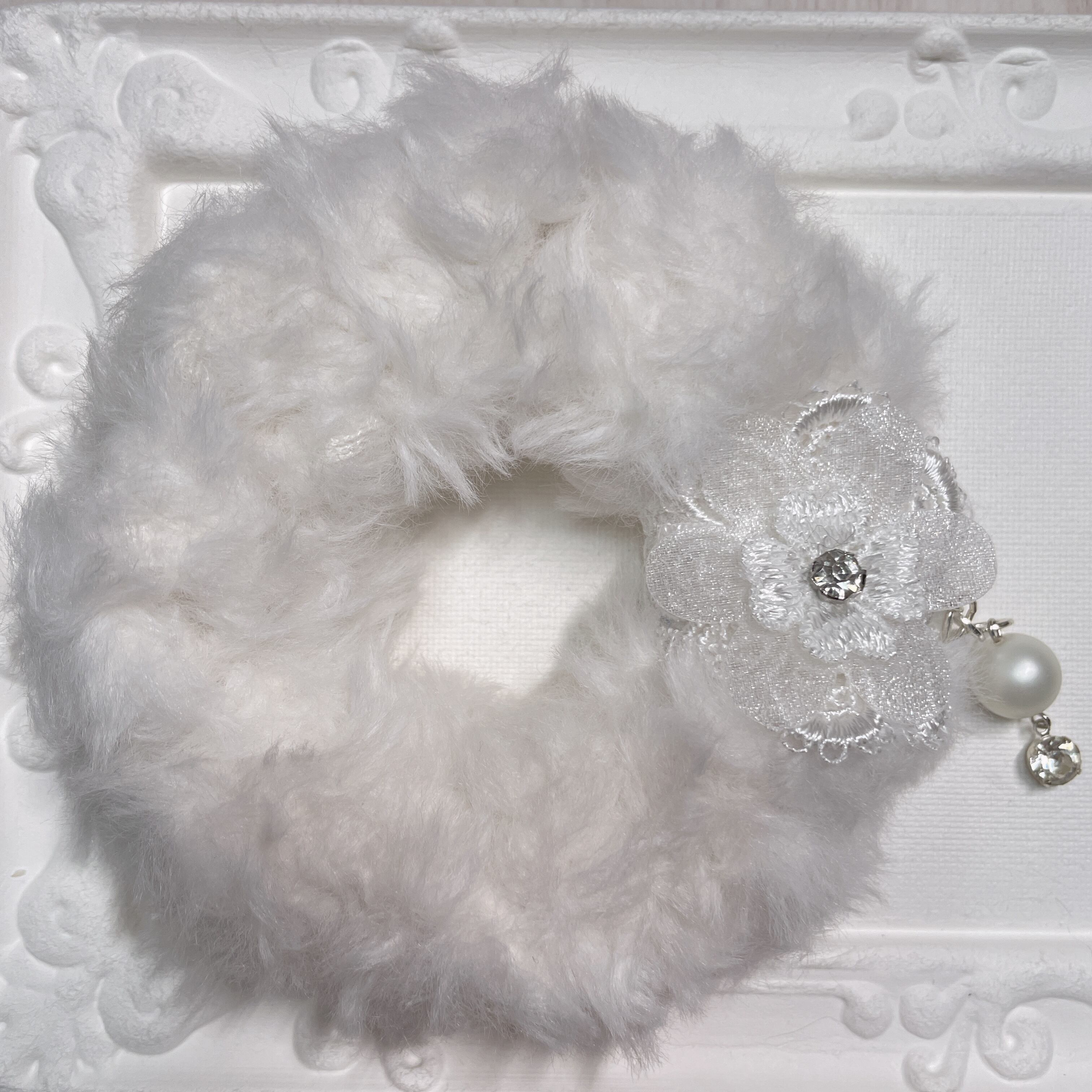 白いファー毛糸で編み上げたシュシュです。ふんわりとした質感で軽い仕上がりになっています。